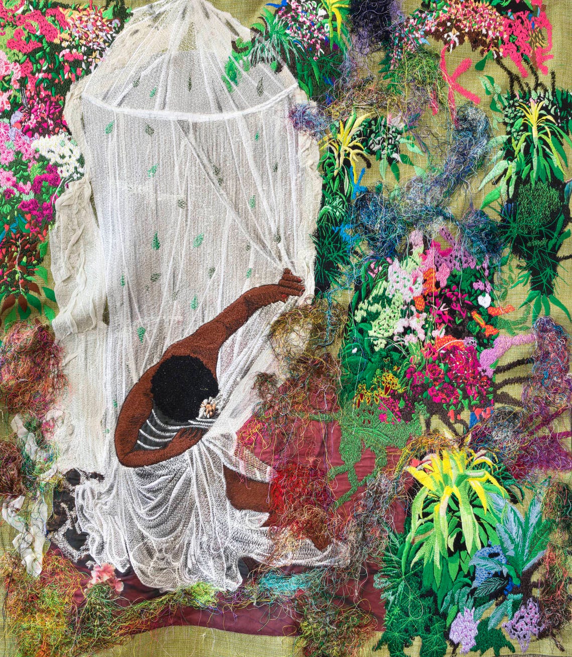 Walking through the tall arch of the gallery into the exhibition turned out to be just a formality: with the luscious greens, yellows, purples and reds filling the rooms, nature’s aliveness was just as palpable inside. In photographs, paintings, video installations and fabrics, were Black people in real and imagined landscapes, in nature in ways I had never seen before in art. Soulscapes challenged the histories of landscape art, a form steeped in Eurocentrism that holds ideas of neutral land, a pastoral idyll, a sentimental utopia. Through the themes of belonging, memory, transformation and joy, the exhibition offered an alternative view on landscape art that put place, identity and power at its core: ‘landscape cannot exist let alone be understood in abstraction from human perception’.
